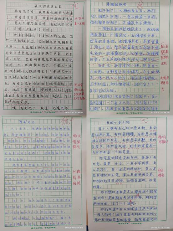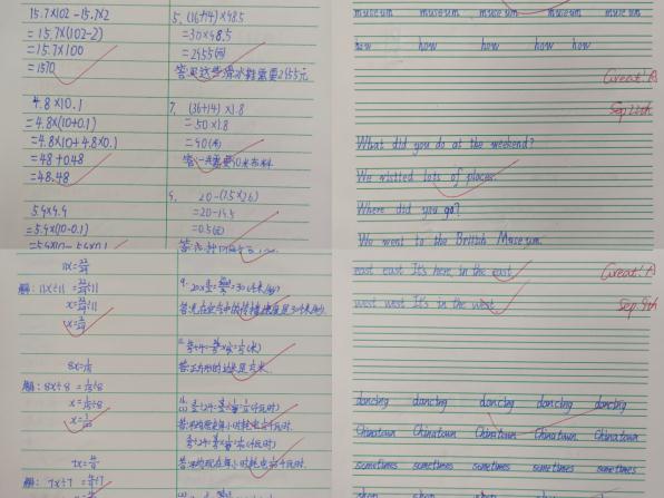 学生作业布置有广度,设置作业有维度,且各位教师均能及时批改作业,能充分发挥评价激励的作用;教师批改记录细致到位,能反映学生作业中的错误及纠正措施。学生作业书写规范,字迹清晰、整洁,不存在折角、烂本现象。